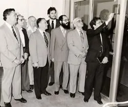 From left to right: Rabbi Kenneth Berger, Rabbi Samuel Mallinger, Lou Gordon, Cantor William Hauben, Charles Segal, Rabbi Yossie Dubrowski, Irving Garber and Rabbi David Rose affixing mezuzzah in 1986